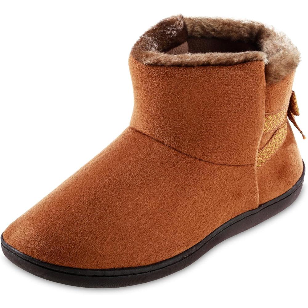 isotoner Women’s Microsuede Mallory Bootie Slippers With Bow(Cognac)